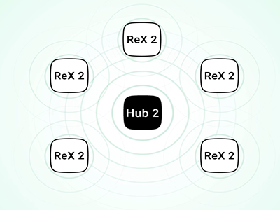 ReX 2 extiende el alcance de la señal de radio del sistema de seguridad, lo que permite instalar dispositivos Ajax a mayor distancia del hub. ReX 2 puede comunicarse con el hub por radio (los protocolos Jeweller y Wings) y por cable Ethernet si los dispositivos están en la misma red.