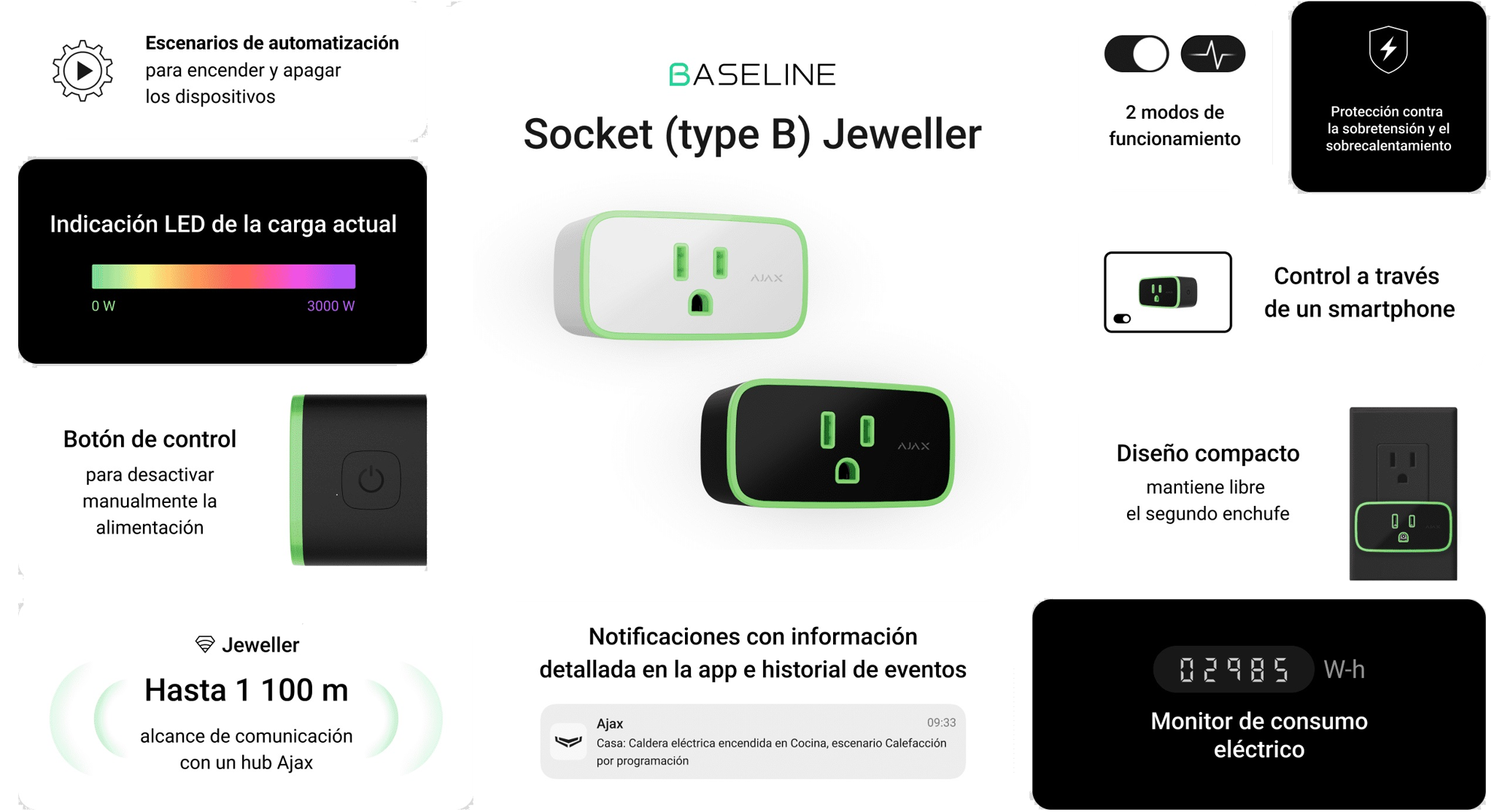 El Socket (type B) Jeweller es un enchufe inteligente e inalámbrico con monitor de consumo eléctrico, diseñado según la norma NEMA 5-15 como adaptador de tomacorriente de tipo B. Cuenta con tres tipos de protección: de tensión, de corriente y de temperatura.