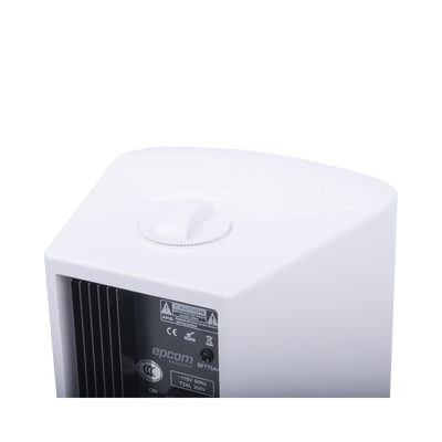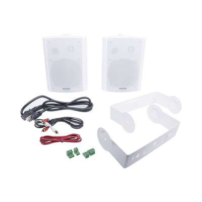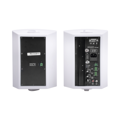 El paquete de altavoces activos está diseñado con controles de volúmen y tono. La potencia de salida nominal es de 20W estable a 8 Ohms. El gabinete está hecho en ABS, la rejilla de metal y el soporte o montaje de metal son de acabado blanco, el montaje se coloca de manera fácil y va incluído.