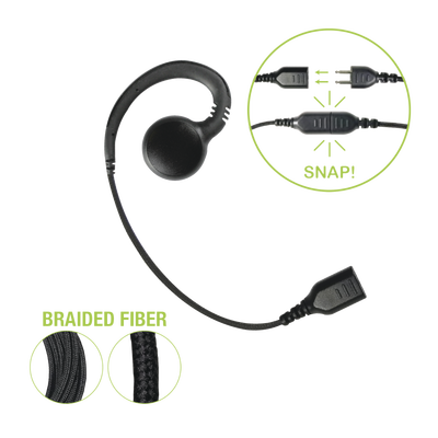 Auricular giratorio con gancho en forma de "G" con cable de fibra trenzada y conector SNAP. Requiere micrófono de solapa de 1 o 2 hilos de la Serie SNAP.
