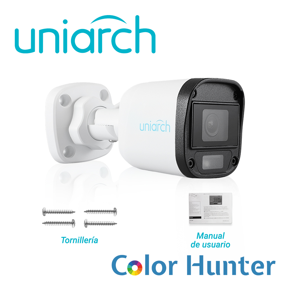 CAMARA ANALOGA MINI BULLET COLORHUNTER UNIARCH UAC-B115-F28-W / 5MP / TVI: 5MP@20fps / LENTE-2.8MM / DWDR / IR20M / ADMITE-GIRO180GRADOS(HORIZONTAL+VERTICAL) / PLASTICA / IP67 / 12 VCD
