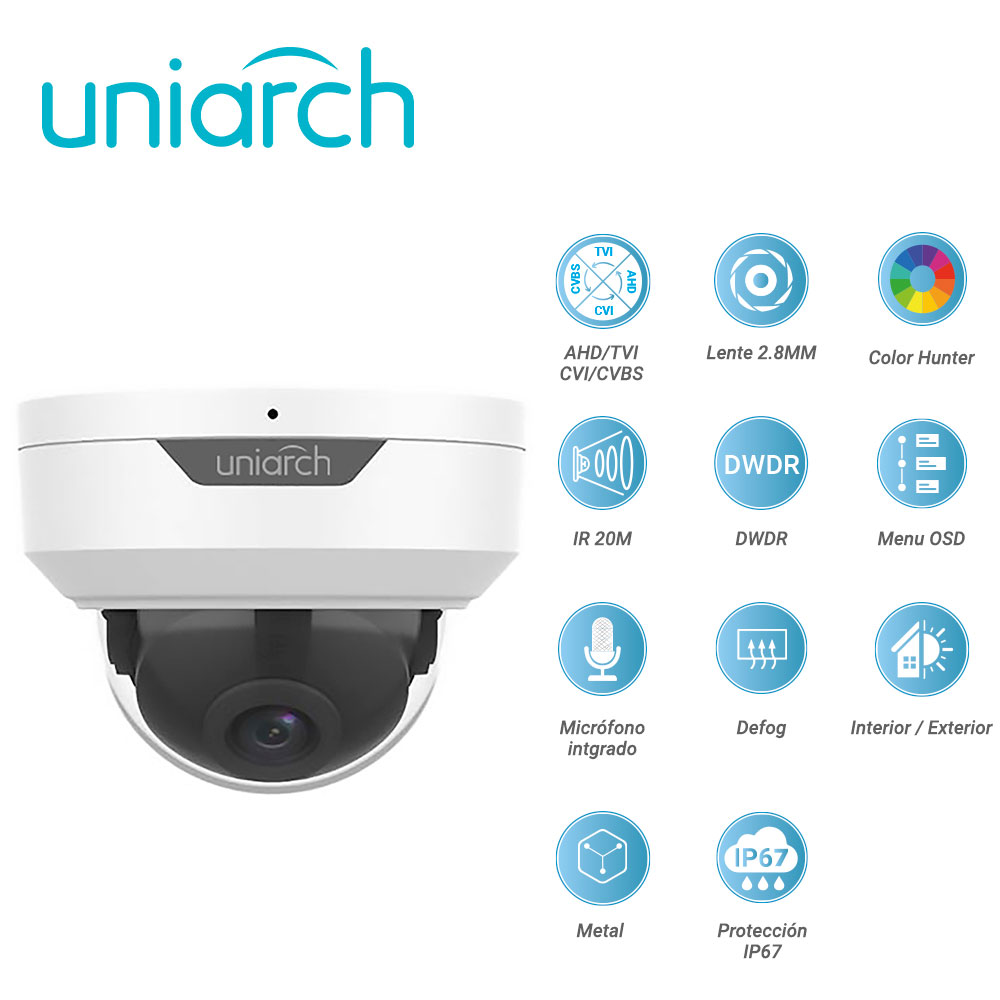 CAMARA ANALOGICA LIGHTHUNTER DOMO UNIARCH UAC-D122-AF28M / UAC-D122-AF28M-H / 2MP / AHD/TVI/CVI/CVBS / LENTE FIJO 2.8 MM / 12 VCD / IP67 / IR 20M / DWDR / MENU OSD / MIC INCLUIDO / DEFOG / 3 AXIS / INTERIOR / EXTERIOR / METALICA