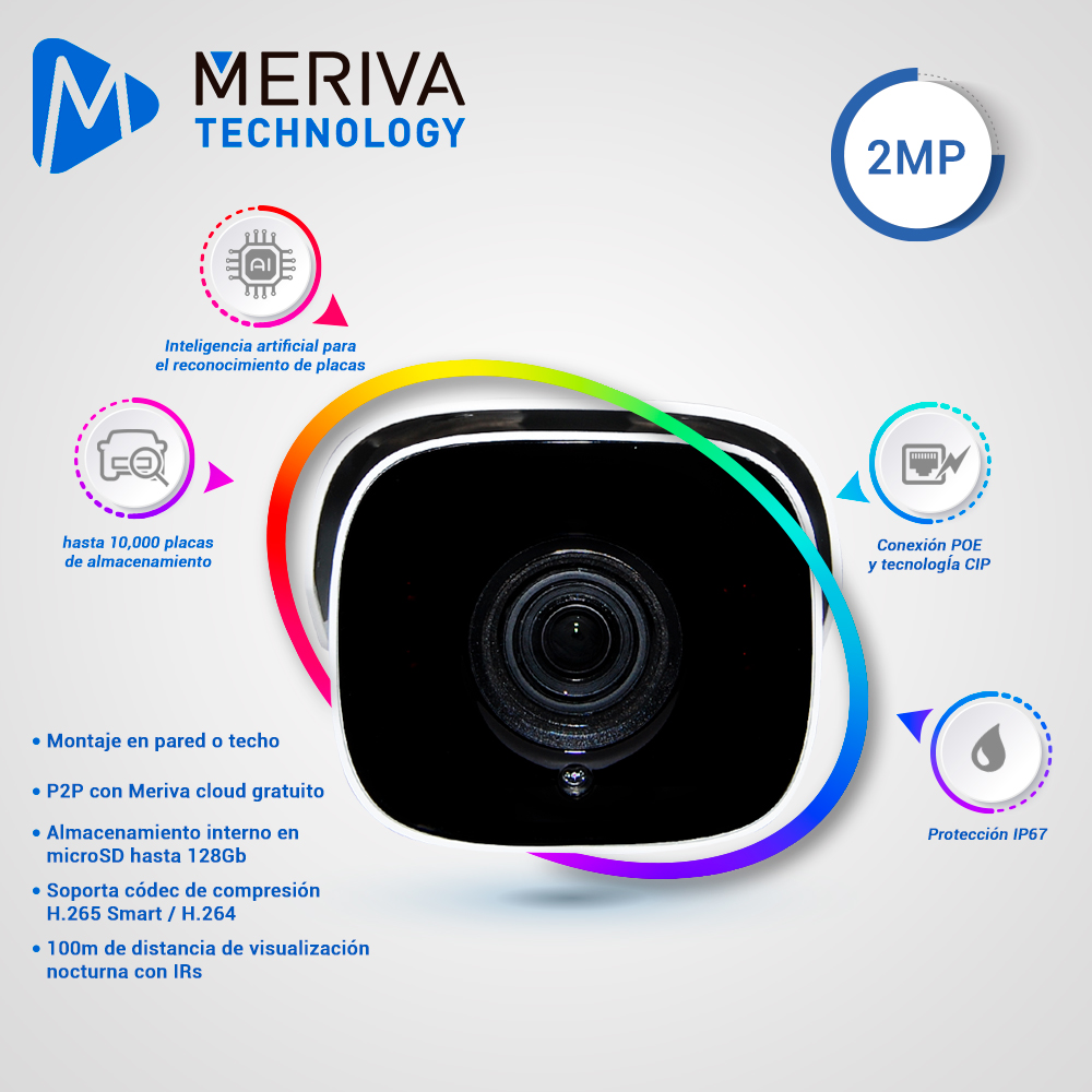 MERIVA TECHNOLOGY - VIDEO IP - MAPR-200 - LPR STAND ALONE / 2 MP La cámara bullet Meriva MAPR-200 está diseñada para soluciones de Video IP ya que tiene embebido inteligencia artificial para el reconocimiento de placas, la velocidad de captura puede alcanzar los 70 km/h trabaja stand alone o se puede integrar con NVR Serie MAIN y configurar y controlar la función de LPR. Cumple con el protocolo TCP/IP, UDP, RTSP, etc., para asegurar que el sistema sea más estable y fiable. Gracias a su conexión POE y tecnología CIP, el proceso de instalación se reduce a 1 sólo paso, "conecta tus cámaras a tu NVR", sin necesidad de configuraciones complicadas. La cámara puede visualizarse de forma remota ya que es P2P a través de Meriva Cloud. Tiene un lente motorizado que permite ajustar el mejor ángulo. La función de LPR puede albergar hasta 10,000 placas y vincularse con la salida de alarma de la cámara para integrarlo con un control de acceso vehicular. Características principales: Resolución 2 MP (1920 x 1080) @ 30 fps. Códec de compresión H.265 / H.265 / H.264 / H.264. Día / Noche automático ICR. Visualización nocturna 100 m IR. Funciones integradas como Real WDR 120 dB, 3DNR, HLC, BLC entre otras. Soporta triple streaming. Entrada / Salida de audio 3.5 mm. Entrada / Salida de alarma. Soporta almacenamiento en Micro SD hasta 256 GB. Alimentación 12 VCD / PoE (802.3 af). Protección IP67. DDNS mymeriva.com gratuito. Conexión P2P Meriva Technology. Analíticos con inteligencia artificial. Compatible con iOS y Android. Software NVMS 2.0 gratuito. Soporta Reset por botón.
