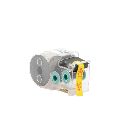 La etiqueta autolaminable de transferencia térmica S100X150VAC incluye un área de impresión blanca y un sobrelaminado transparente para proteger la leyenda y facilitar su identificación. Tiene un tamaño específico para aplicaciones de alambres y cables. El casete contiene un dispositivo de memoria integrado para el formateo automático, la recuperación de la última leyenda utilizada y el número de etiquetas restantes.