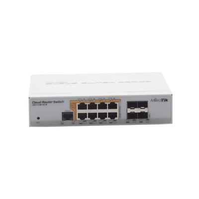 CRS112-8P-4S-IN es un Switch PoE de ocho Gigabits RJ45, que ofrece diferentes opciones de salida de energía: detección automática de 802.3af/at PoE/PoE+ y PoE pasivo, y cuatro puertos SFP brindan opciones de conectividad de fibra óptica para admitir enlaces ascendentes de hasta 1 Gbps.