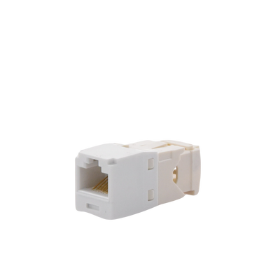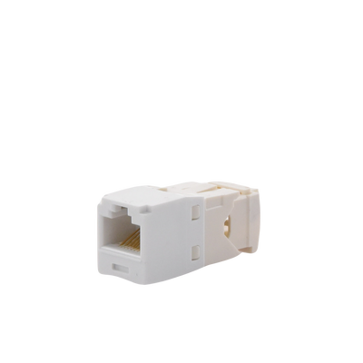El módulo de conector UTP Categoría 6/Clase E de 8 posiciones, se termina en cable de 4 pares 22 - 26 AWG de par trenzado sin blindaje de 100 ohms y no requiere el uso de una herramienta de impacto. Los módulos de conector UTP usan un método de terminación de movimiento hacia adelante para optimizar el rendimiento al mantener la geometría del par de cables mientras se elimina el destrenzado del conductor. La tapa de terminación esta codificada por color blanco para designar el rendimiento de la Categoría 6 e incluye una etiqueta universal codificada para los esquemas de cableado T568A y T568B.