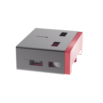 El dispositivo de bloqueo USB tipo A SmartKeeper protege los puertos USB-A para limitar o evitar el acceso no autorizado mediante la adición de una capa física. También puede proteger el puerto del polvo y los residuos o de daños causados ​​por objetos extraños. Solo se puede quitar con la llave maestra SmartKeeper. El dispositivo es de color rojo.