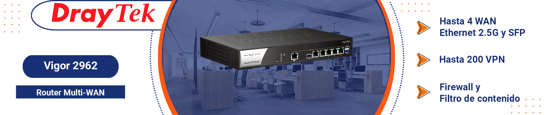 Es un router multi-WAN diseñado para pequeñas y medianas empresas. Sirve para gestionar múltiples conexiones a Internet y balancear la carga de tráfico de red para conexiones seguras. Incluye 1 puerto WAN de 2.5GB y 1 puerto combo SFP & RJ45 WAN para flexibilidad en las conexiones, 2 puertos LAN & WAN GE y 2 LAN RJ45 GE para una red rápida y confiable, y filtrado web para mejorar la seguridad y controlar el acceso a contenidos. Ideal para empresas que necesitan un router robusto y versátil para una red segura y eficiente.