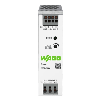 La fuente de alimentación con sincronización primaria WAGO, modelo 2587-2144, es un dispositivo monofásico diseñado para proporcionar una tensión de salida de 24V DC y una corriente de salida de 5A. Cuenta con un indicador LED DC-OK para la señalización del estado operativo y una alta eficiencia del 88%, además de soportar conexión en paralelo y en línea. Su diseño compacto permite el montaje en carril DIN-35 y ofrece un sistema de conexión rápida y segura mediante tecnología Push-in CAGE CLAMP.