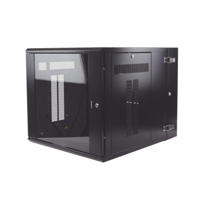 Gabinete de montaje en pared construido en acero, soporta 12 unidades de Rack para equipos de red activos o pasivos. Cuenta con paneles laterales totalmente desmontables y esta diseñado para permitir el control de clima adecuado para uso con diversos equipos de red, así como Switches de alimentación remota (PoE) y fuentes de alimentación ininterrumpida (UPS).
