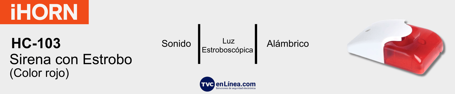 Descripción Descripción Información General Descripción Esta sirena cableada está construida con una resistente carcasa de plástico ABS y podría funcionar con la mayoría de los sistemas de alarma. Cuando se produce una alarma, incorporada con una fuerte luz estroboscópica y sonido.Características:Modelo: HC-103Corriente nominal (mA): ≤300Tensión nominal (V DC): 12Rango de voltaje de operación (V DC): 9-15Destellos / Minuto: 200 ± 30SPL: 108 ± 3 (dB / 30cm)CompatibilidadDSCAJAX (utilizando AJX1200003 y Fuente de Poder)BOSCHRISCOEtc. Variedad de productos en TVC en Línea DocumentosHC-103_FichaTécnica_Español.pdfHC-103_FichaTécnica_Inglés.pdf