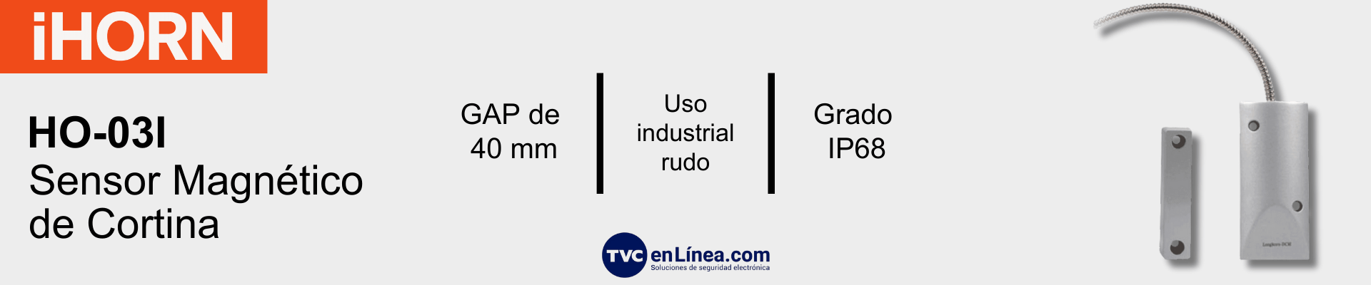 El iHORN HO-03I es un sensor magnético de uso rudo (tipo Overhead), diseñado específicamente para la protección de accesos pesados como cortinas metálicas, portones de garaje y puertas industriales, ajustable para adaptarse a la mayoría de los anchos de canal de puerta. Se compone de dos partes: un imán blindado que se instala en la parte móvil (la cortina o portón) y un interruptor de láminas (reed switch) protegido por una carcasa de aluminio fundido que se fija al suelo. Su diseño permite un GAP (brecha de activación) amplio, lo que evita falsas alarmas provocadas por el movimiento natural o desajuste de las cortinas metálicas pesadas.