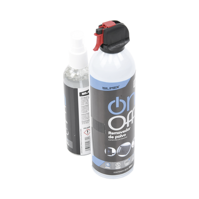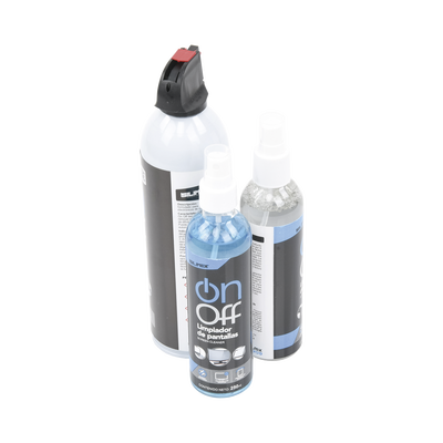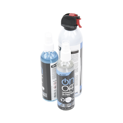 Elimina el polvo de tus equipos con el Aire Comprimido On/Off. Rocía y aplica el Limpiador de Equipos Electrónicos On/Off en la Microfibra y limpia el exterior de tus aparatos electrónicos (no pantallas). Rocía y aplica el Limpiador de Pantallas On/Off en la otra Microfibra y limpia cualquier tipo de pantallas.