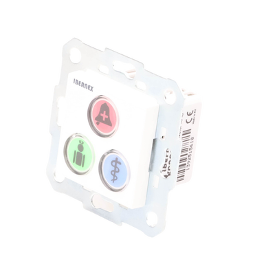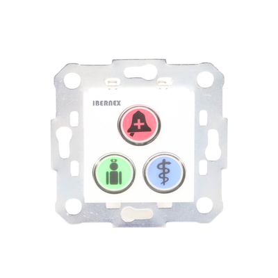 El módulo de botones NX0392 es uno de los periféricos del sistema de llamadas paciente-enfermra de Ibernex. Los tres botones disponibles en el módulo se encuentran iluminados bajo configuración y permiten desencadenar llamadas de petición de ayuda, ayuda urgente y alarma médica.