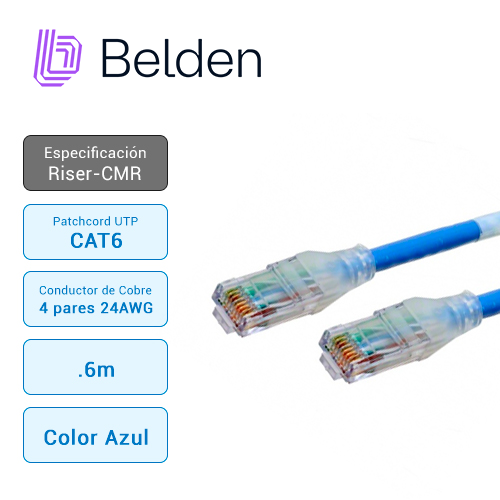 PATCH CORD UTP CAT6+ BELDEN C601106002 / INTERIOR / AZUL / 4 PARES / 24 AWG / FORRO PVC / CMR / 2 PIES 0.6 METROS