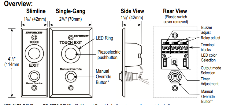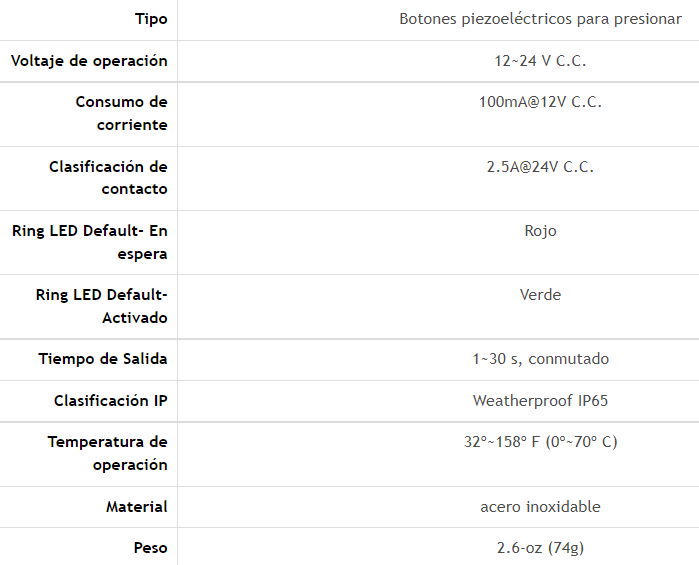 Descripción Descripción SD-6176-SS1QBOTÓN DE PETICIÓN DE SALIDACARACTERISTICAS:Placas piezoeléctricas de solicitud de salida para uso en interiores o exteriores (IP65) Sin partes móviles para uso intensivo El anillo LED alrededor del botón cambia de verde a rojo o de rojo a verde cuando se presiona el botónSalida temporizada o conmutada SD-6176-SSVQ y SD-6276-SSVQ incluyen un botón de anulación manual separado para usar en caso de un corte de energía en la placa de solicitud de salida Relé clasificado 2.5A@24VDC con dos salidas programables individualmente (NA / NC)NO INCLUYE CAJA DE MONTAJE ESPECIFICACIONES: