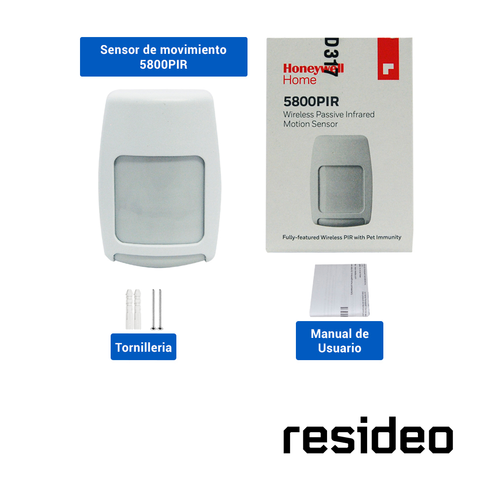 SENSOR DE MOVIMIENTO RESIDEO 5800PIR INALAMBRICO/ ANTIPET (INMUNIDAD A MASCOTAS DE MENOS DE 36KG)/ VISTA DE AREA INFERIOR SELECCIONABLE/ RANGO DE DETECCION 11X12MTS/ COMPATIBLE CON LOS PANELES RESIDEO INALAMBRICOS / BATERIA INCLUIDA