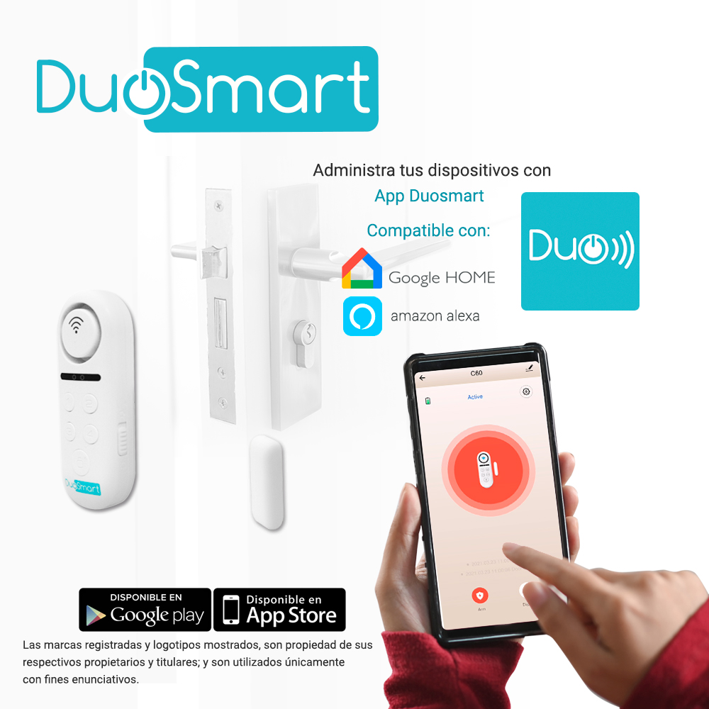 SENSOR MAGNETICO WIFI STANDALONE C60C60 es un sensor con sirena para que te enteres de manera audible y en tu dispositivo móvil mediante la aplicación Duosmart cada que alguien abra o cierre una puerta o ventana. Arma y desarma de manera manual o por medio de la aplicación, C60 cuenta con 2 modos de operación Armado en casa donde notifica y suena de manera inmediata cuando se viola la seguridad del lugar donde la instalas. Armado fuera de casa cuando usas este modo y armas el sistema al llegar a casa te dará 30 segundos al abrir la puerta para que puedas llegar y desarmar el sistema antes de emitir la alerta audible. Puedes crear una contraseña con su teclado de 4 digitos para desarmar de manera manual el sistema. Tiene 2 tipos de sonido para que los uses a conveniencia, uno similar a un timbre de 2 tonos (ding dong) que suena una sola vez; muy útil para comercios donde solo quieres enterarte cuando alguien entró sin que nadie se alerte y el segundo es una sirena convencional que suena de forma constante hasta que desarmes el sistema. Compatible con automatizaciones con equipos de la marca y con Alexa® y Google Home® para que puedas armar y desarmar con voz además crear escenas con otros dispositivos. La solución ideal y accesible para cualquier hogar y negocio de conveniencia. Características Sensor magnético incluído Sirena integrada Opción de contraseña 2 tipos de armado 2 tipos de sonido Especificaciones Uso interior Uso de batería AAA Nivel de sonido 120dB Conectividad WiFi 2.4 GHz (No acepta 5 banda GHz) Compatible con Alexa® Google Home®