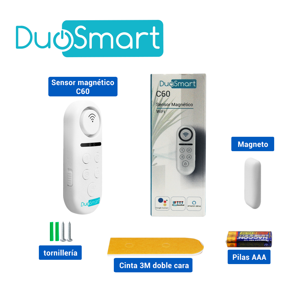 SENSOR MAGNETICO WIFI 2.4 GHZ DUOSMART C60 CON SIRENA INCLUIDA 2 MODOS DE OPERACION 2 SONIDOS DE NOTIFICACION COMPATIBLE CON ESCENAS EN APP Y EN ASISTENTES VIRTUALES ALEXA Y GOOGLE HOME **NO ACEPTA DISPOSITIVOS ADICIONALES**