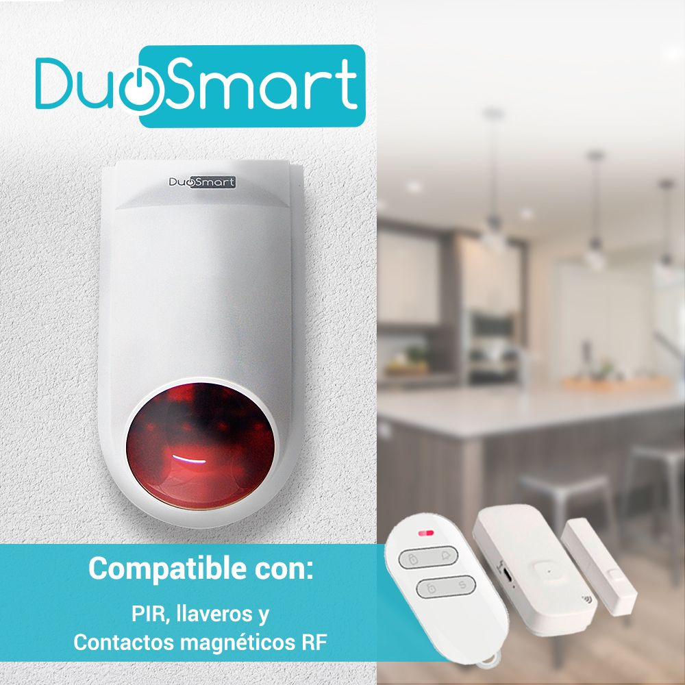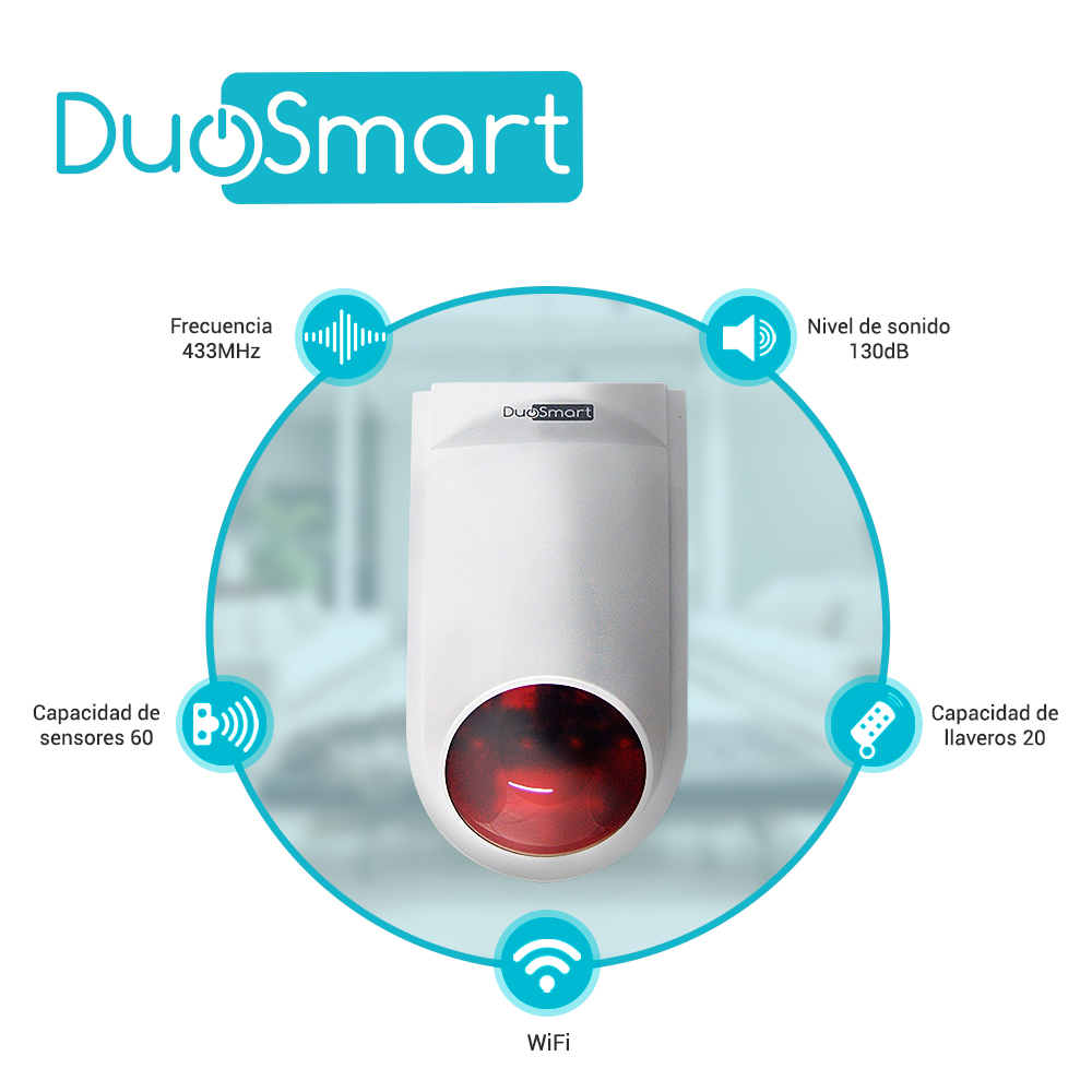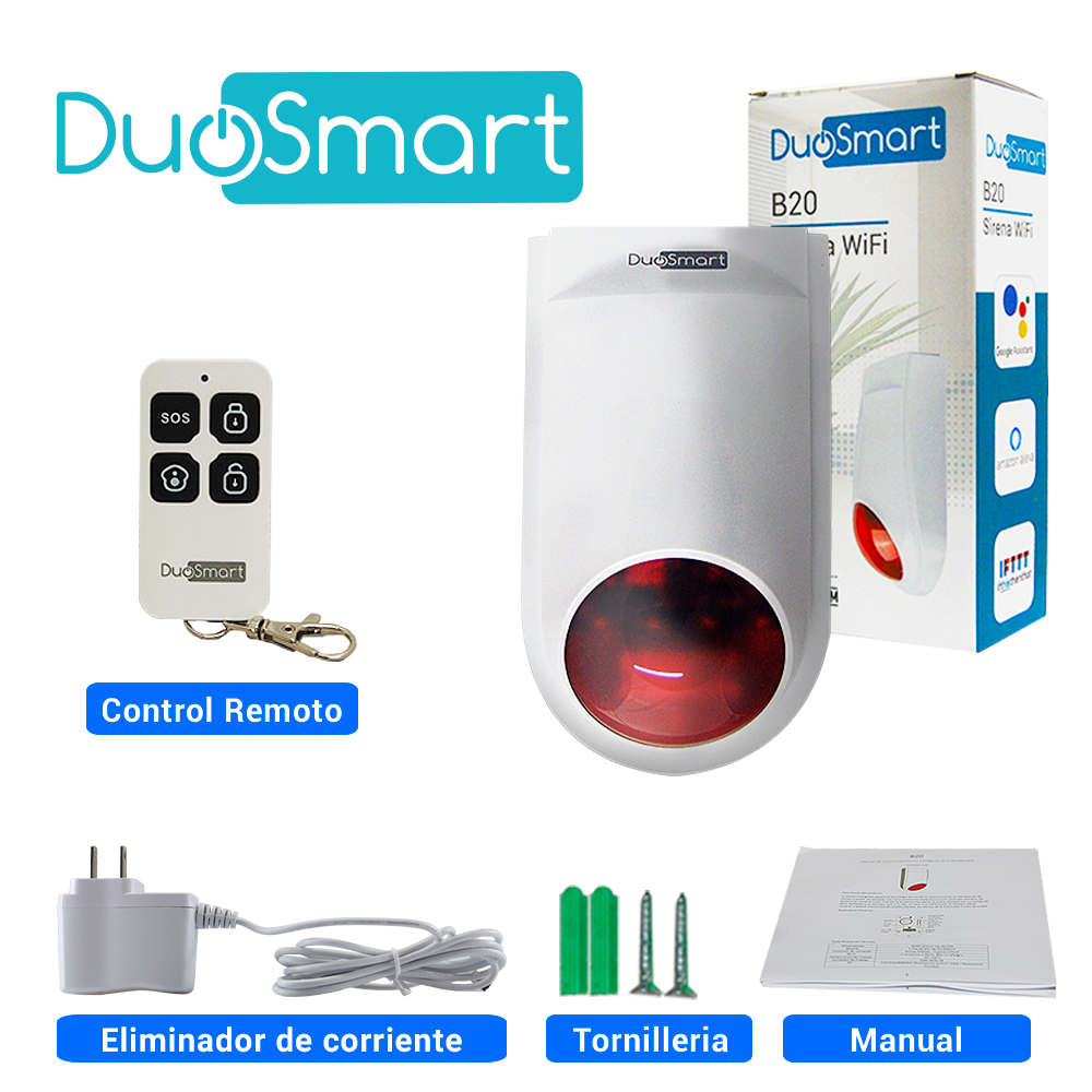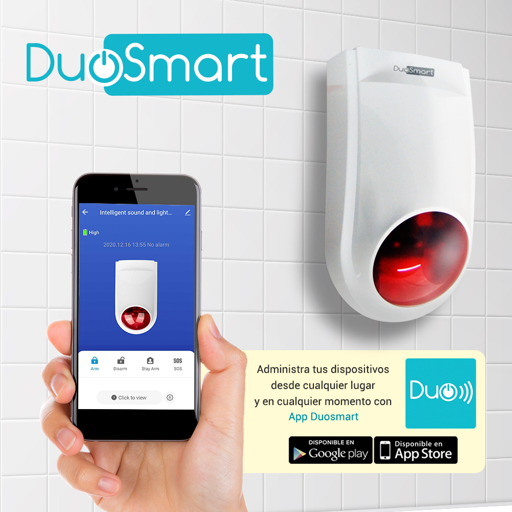 SIRENA INTELIGENTE WIFI 2.4 DUOSMART B20 STANDALONE MONITOREO EN APP DUOSMART **SOPORTA DISPOSITIVOS RF DUOSMART SERIE C** 20 CONTROLES 60 DISPOSITIVOS EN MODO 24HRS AUDIBLE INTERIORES O PERIMETRALES