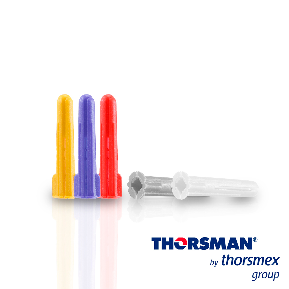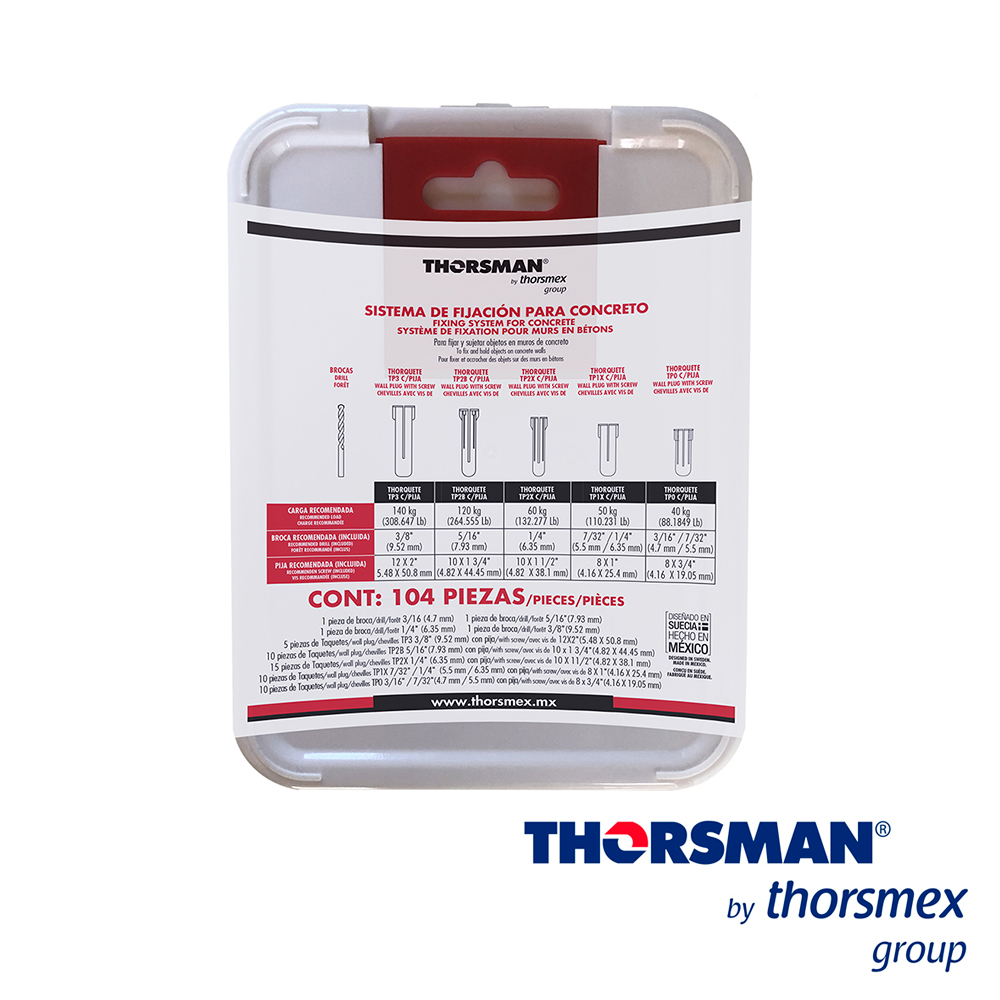 SISTEMA DE FIJACION THORSMAN MODELO 3701-02000 PARA CONCRETO -Taquetes para fijar objetos con tornillo en muros y techos deconcreto o superficies sólidas.-Realiza una doble expansión, es decir que abre hacia loscuatro puntos cardinales.- Consta de 2 aletas que no permiten que el taquete gire dentrodel orificio cuando se introduce el tornillo.-Posee un cuello que impide que el taquete se hunda, aúncuando la perforación sea más profunda.-Tiene una guía que permite que el tornillo se introduzcacorrectamente.- Libre de rebaba que impida la doble expansión- Flexible