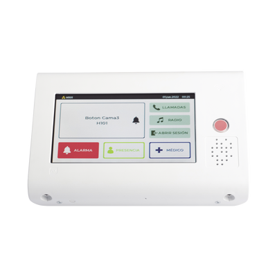 Posee una pantalla táctil de 7' desde la que se puede consultar y registrar la actividad del personal, así como gestionar llamadas y controlar los posibles canales de megafonía configurados. Además, gracias a su lector RFID integrado, el personal del centro puede identificarse mediante tarjeta para la gestión de alarmas y tareas.