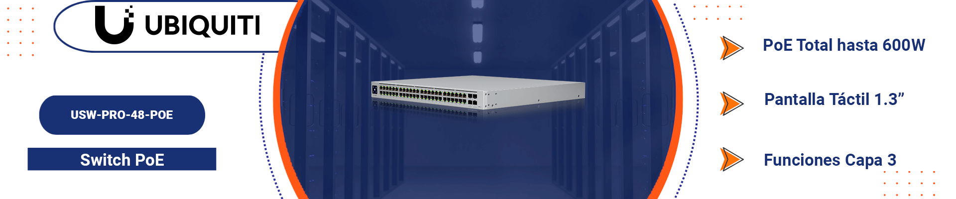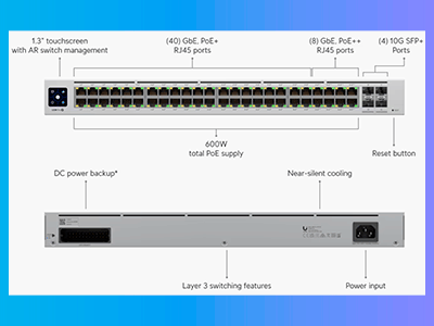 UniFi Switch Pro 48 PoE es un conmutador de capa 3 totalmente administrado con (8) puertos 802.3bt (PoE ++) y (40) 802.3at (PoE +) Gigabit Ethernet. (4) Los enlaces ascendentes 10G SFP + ofrecen agregación de enlaces para mayor capacidad y mayor disponibilidad. El UniFi Switch Pro 48 PoE presenta un amplio conjunto de capacidades de Capa 2 e integra la funcionalidad de Capa 3, como enrutamiento entre VLAN, enrutamiento estático y servidor DHCP.