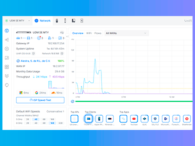 La gestión se realiza mediante el controlador UniFi, que ofrece una plataforma centralizada para administrar y monitorear dispositivos de red. La interfaz proporciona un panel de control intuitivo que muestra un resumen del estado de la red, incluyendo gráficos y estadísticas del switch. Permite la configuración unificada de todos los parámetros del switch y otros dispositivos UniFi desde una sola interfaz.