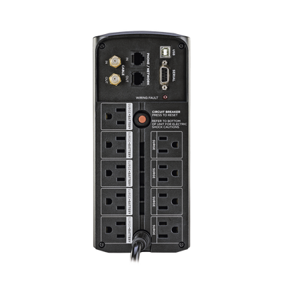 El UPS presenta una pantalla LCD multifunción para mostrar información sobre la potencia y las condiciones de la batería. La protección de línea telefónica incluida puede proteger los teléfonos contra sobretensiones y picos. También es compatible con PowerPanel® Power Management Software para realizar un apagado ordenado de la PC.