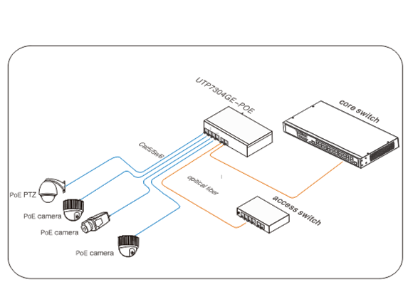 Los switches Utepo UTP7304GEPOE cuentan con 6 puertos full Gigabit Ethernet, de los cuales cuenta con 4 puertos RJ-45 para descarga de información y dos puertos SFP para la subida de información.